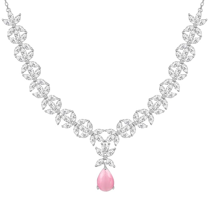 - The silver necklace features zircon studded leaves with pink stone droplets