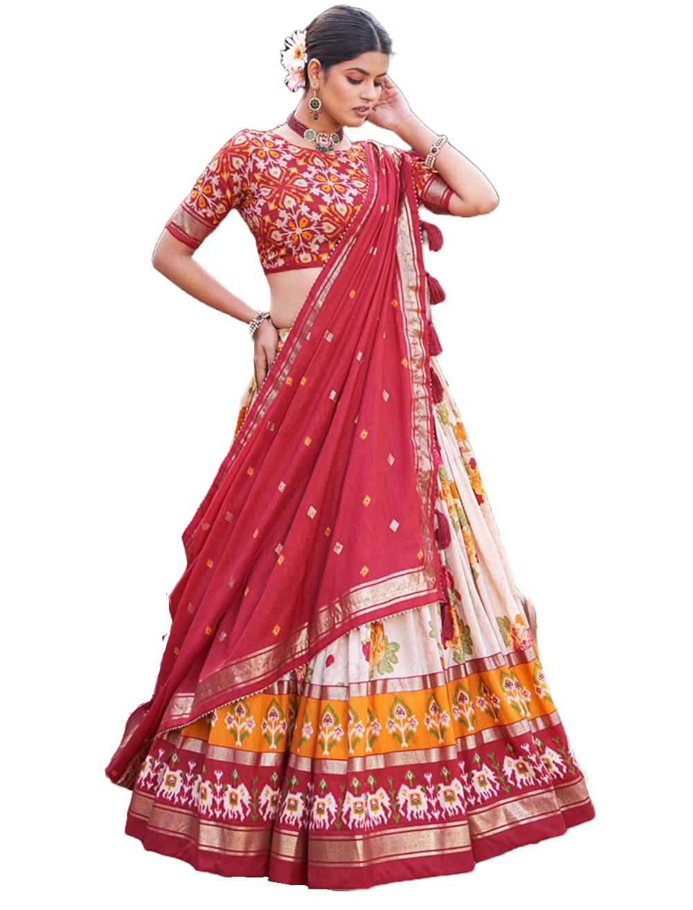 - Lehenga Work : ikkat patola Print With Foil Work Border ,Blouse Work : Printed With Foil Work Border ,Dupatta Work : ikkat patola Print With Gotta Patti Lace Border Also Comes With Tassels
